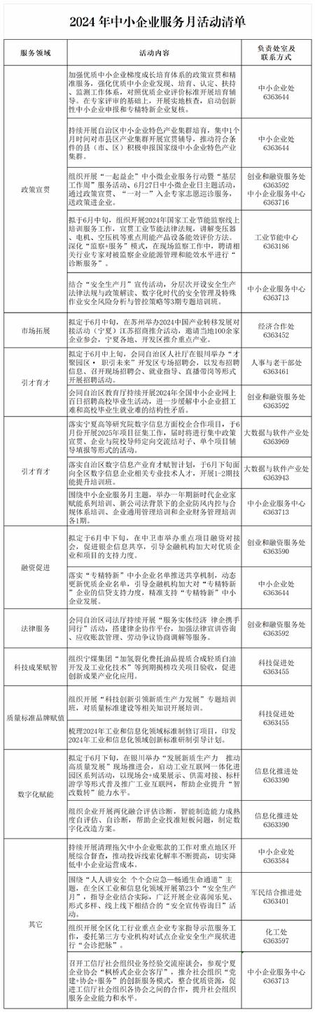 一、自治区工业和信息化厅从政策宣贯、市场拓展、引才育才、融资促进、法律服务、科技成果赋智、质量标准品牌赋值、数字化赋能等方面梳理形成服务活动清单,各级中小企业主管部门要加强与有关单位沟通对接,充分发挥中小企业公共服务平台网络单位、中小企业公共服务示范平台、小型微型企业创业创新示范基地作用,汇聚和带动各类优质服务资源,因地制宜组织开展创新性、特色化中小企业服务活动。各单位要力戒形式主义,真正深入园区、深入企业,帮助中小企业解决好生产运营中的困难和问题,着力提升企业获得感和满意度。